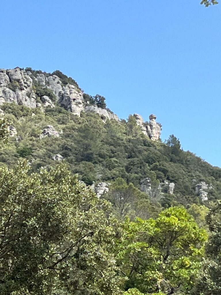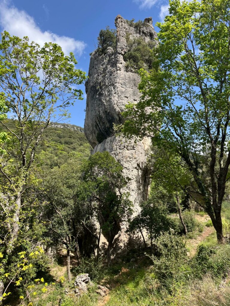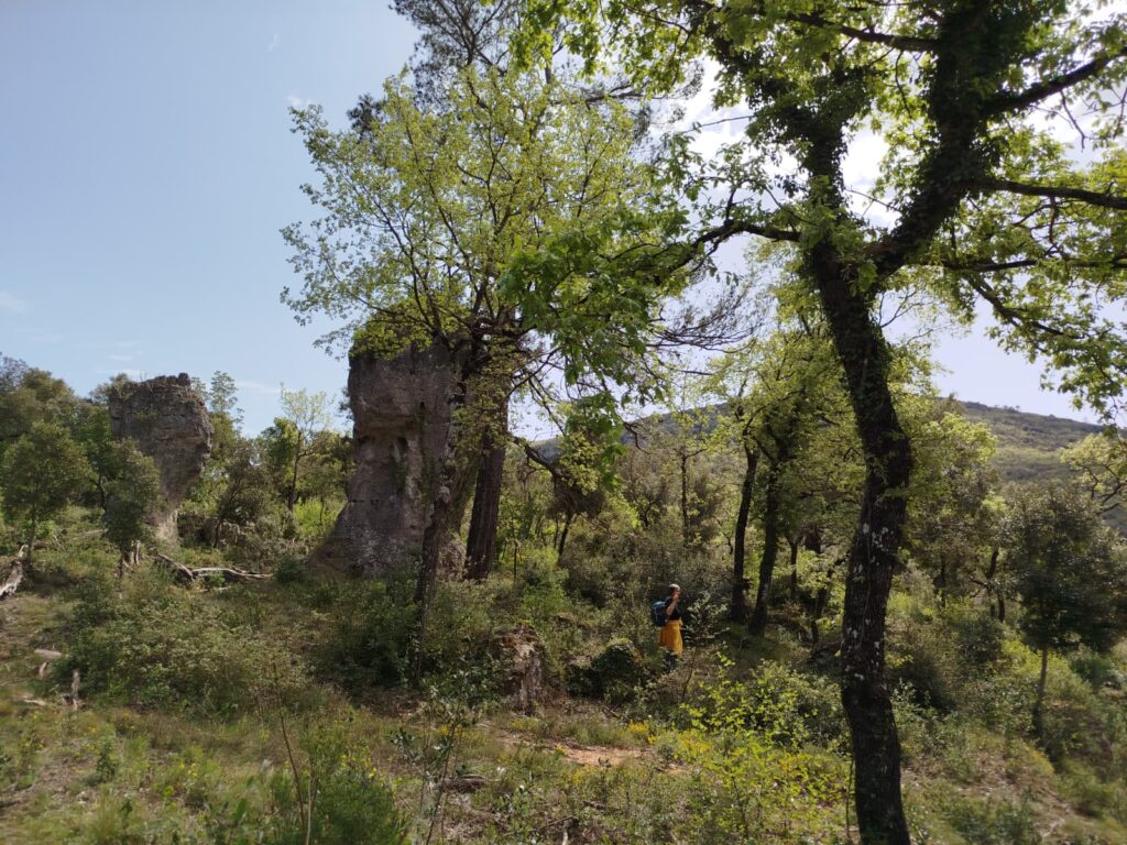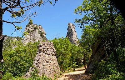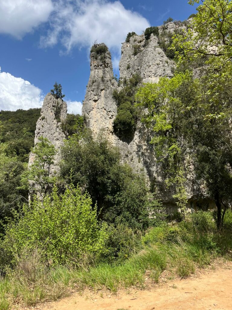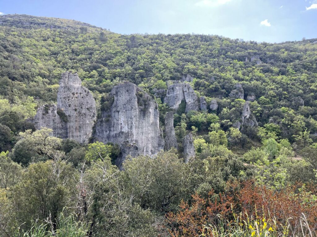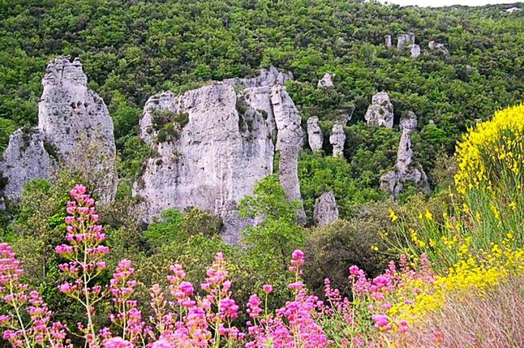 Surgissant au creux d’un vallon, ces pitons rocheux sont de véritables curiosités géologiques. Issues de calcaires dolomitiques du Jurassique inférieur, ces roches contiennent des carbonates de calcium et du magnésium. Leur formation s’explique ainsi : une fois le calcium dissous et emporté par les eaux de pluie, reste le magnésium dont l’érosion crée des reliefs « ruiniformes » : aiguilles, tourelles, arches, etc. Avec un peu d’imagination, on pourrait même y voir des formes animales…
