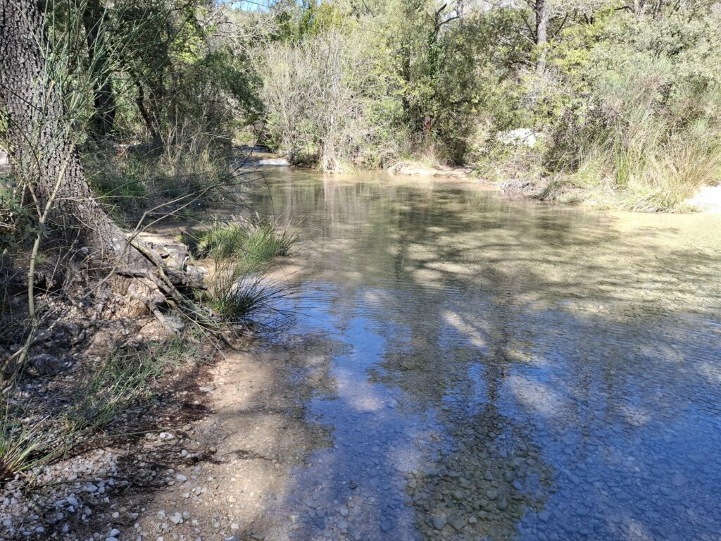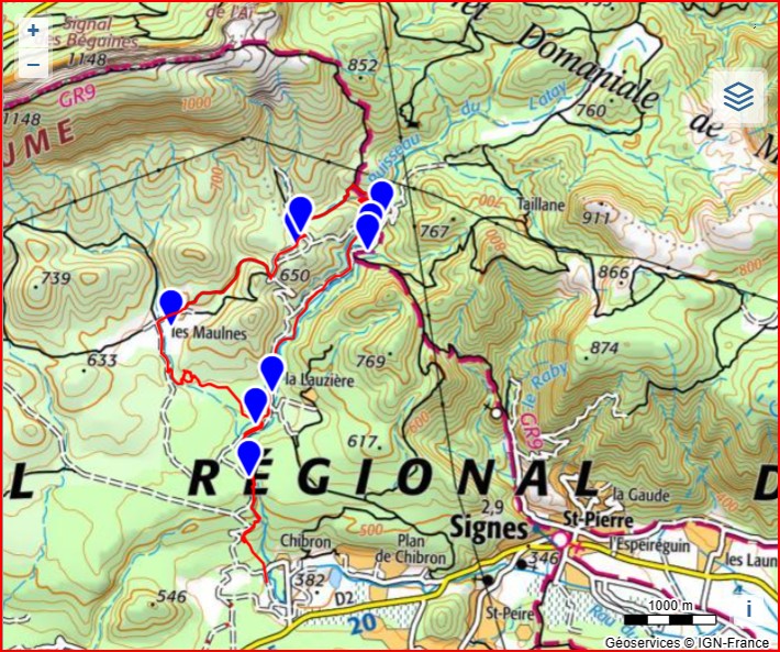 Départ du lieu dit Chibron (commune de Signes),  du grand parking, sur un sentier caillouteux, au carrefour des pistes, qui permet de suivre le canal  et le cours d’eau du Latay.