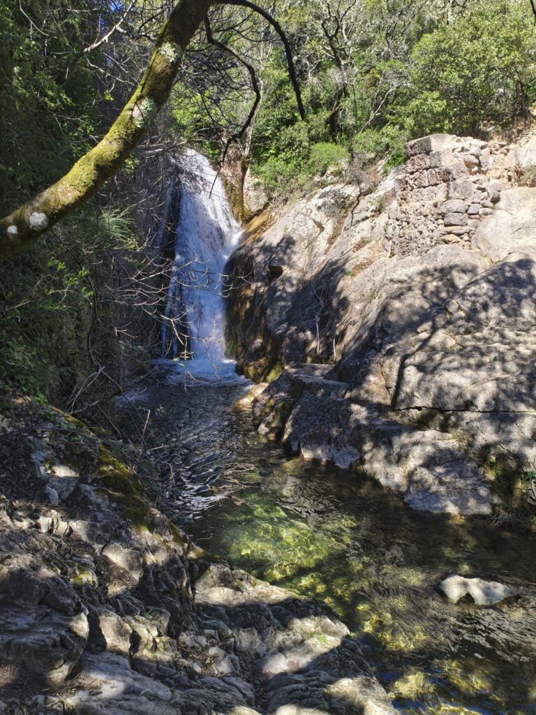 Puis ils ont tourné à gauche par le petit chemin balisé jaune montant à travers le sous-bois. Ils sont passés devant un bassin et une source.    Ensuite, ils ont poursuivi à gauche l’ascension par le sentier balisé jaune, traversé une large piste et ont continué tout droit la montée raide par le chemin caillouteux.