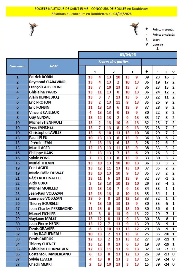 Résultats du concours en doublettes du vendredi 3 Avril 2026