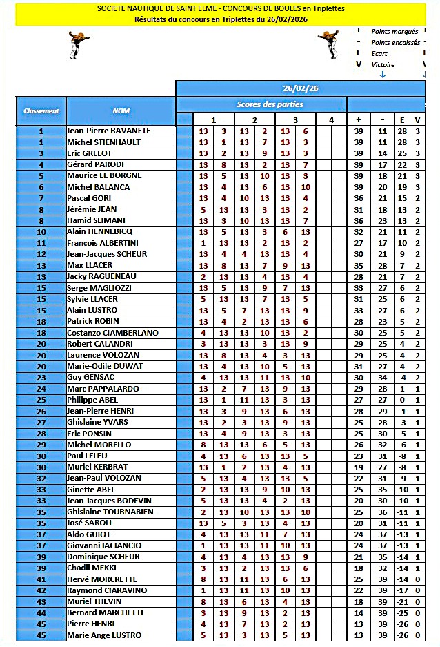Résultats du concours de pétanque en triplettes du Jeudi 26 février 2026